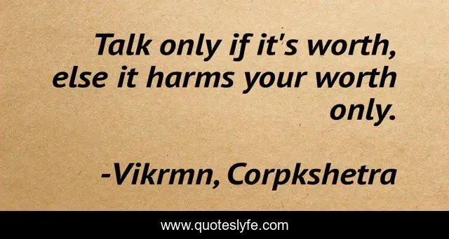 This page presents the quote "Talk only if it's worth, else it harms your worth only.". Author of this quote is Vikrmn, Corpkshetra. This quote is about corpkshetra, harm, vikram, positive, worth, motivational, confidence, ca-vikram-verma, chartered-accountant,.
