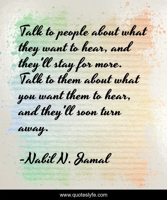 This page presents the quote "Talk to people about what they want to hear, and they'll stay for more. Talk to them about what you want them to hear, and they'll soon turn away.". Author of this quote is Nabil N. Jamal. This quote is about customise, nabil-n-jamal, interest, people, nabil, stay, leadership, hear, turn-away,.