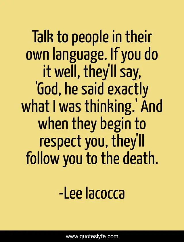 This page presents the quote "Talk to people in their own language. If you do it well, they'll say, 'God, he said exactly what I was thinking.' And when they begin to respect you, they'll follow you to the death.". Author of this quote is Lee Iacocca. This quote is about thinking, god, death,.