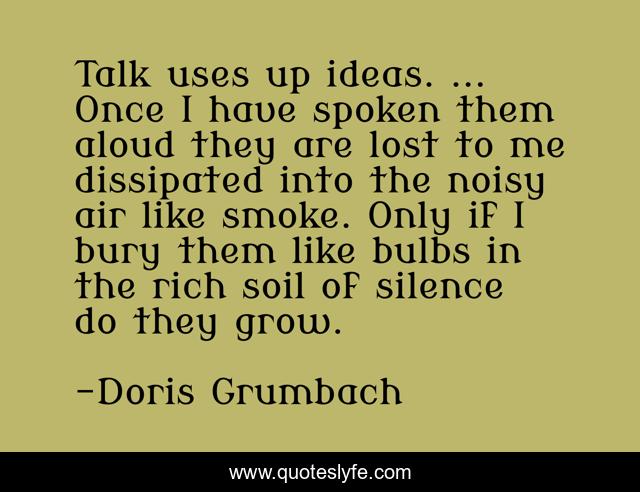 This page presents the quote "Talk uses up ideas. ... Once I have spoken them aloud they are lost to me dissipated into the noisy air like smoke. Only if I bury them like bulbs in the rich soil of silence do they grow.". Author of this quote is Doris Grumbach. This quote is about control, self,.