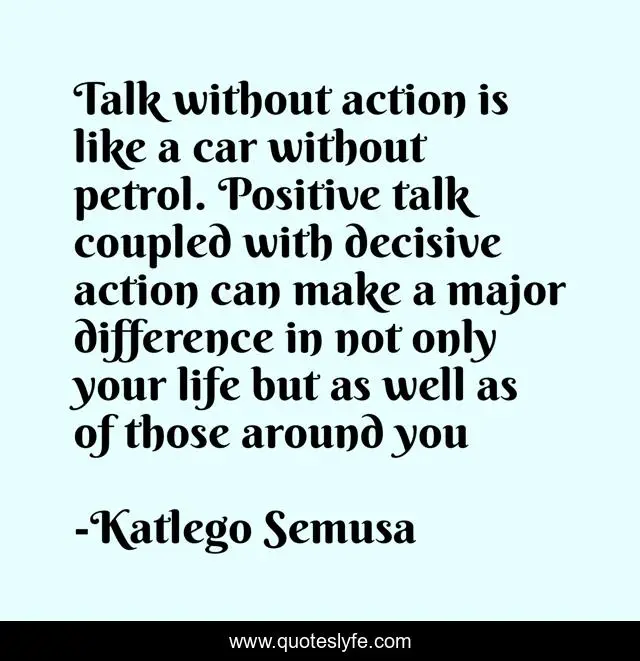 This page presents the quote "Talk without action is like a car without petrol. Positive talk coupled with decisive action can make a major difference in not only your life but as well as of those around you". Author of this quote is Katlego Semusa. .