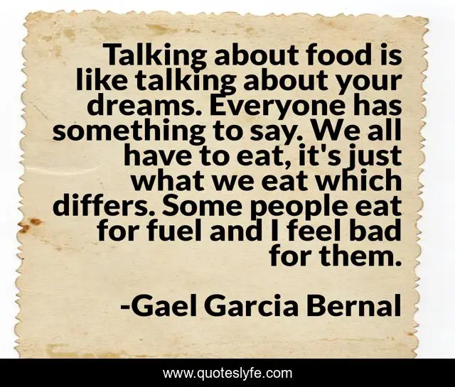 This page presents the quote "Talking about food is like talking about your dreams. Everyone has something to say. We all have to eat, it's just what we eat which differs. Some people eat for fuel and I feel bad for them.". Author of this quote is Gael Garcia Bernal. This quote is about food, your dreams, people,.