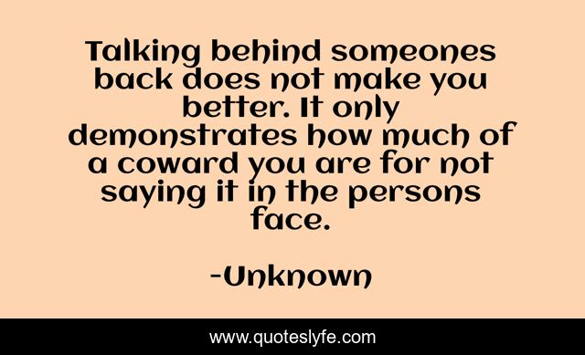 This page presents the quote "Talking behind someones back does not make you better. It only demonstrates how much of a coward you are for not saying it in the persons face.". Author of this quote is Unknown. This quote is about gossip, frienship,.