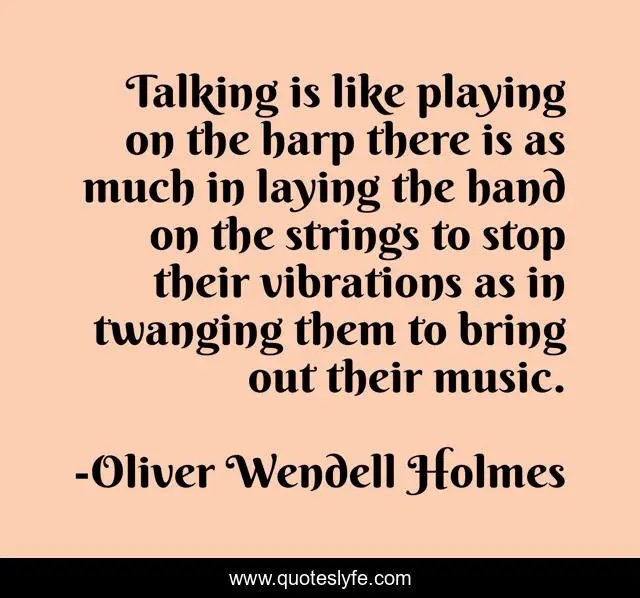 This page presents the quote "Talking is like playing on the harp there is as much in laying the hand on the strings to stop their vibrations as in twanging them to bring out their music.". Author of this quote is Oliver Wendell Holmes. .