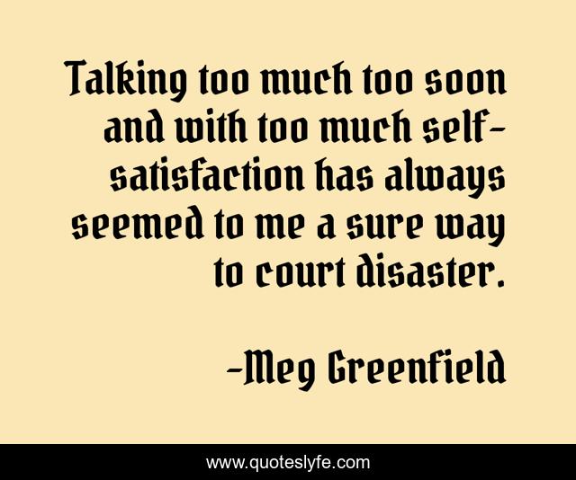 This page presents the quote "Talking too much too soon and with too much self-satisfaction has always seemed to me a sure way to court disaster.". Author of this quote is Meg Greenfield. This quote is about control, self,.