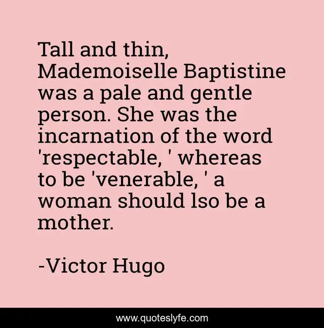 This page presents the quote "Tall and thin, Mademoiselle Baptistine was a pale and gentle person. She was the incarnation of the word 'respectable, ' whereas to be 'venerable, ' a woman should lso be a mother.". Author of this quote is Victor Hugo. This quote is about respect, mother, women,.