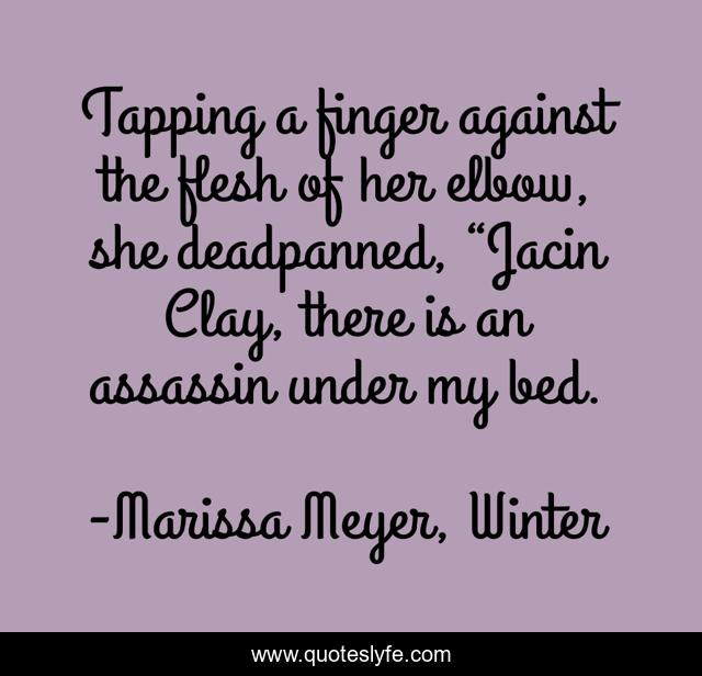 This page presents the quote "Tapping a finger against the flesh of her elbow, she deadpanned, “Jacin Clay, there is an assassin under my bed.". Author of this quote is Marissa Meyer, Winter. This quote is about jacin-clay, winter,.