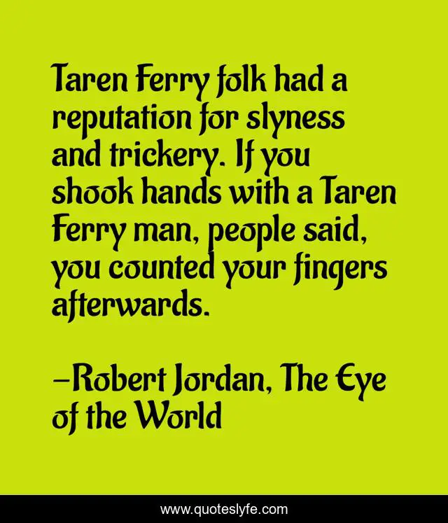 This page presents the quote "Taren Ferry folk had a reputation for slyness and trickery. If you shook hands with a Taren Ferry man, people said, you counted your fingers afterwards.". Author of this quote is Robert Jordan, The Eye of the World. .