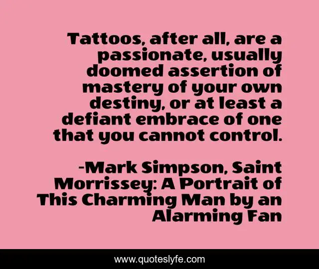 This page presents the quote "Tattoos, after all, are a passionate, usually doomed assertion of mastery of your own destiny, or at least a defiant embrace of one that you cannot control.". Author of this quote is Mark Simpson, Saint Morrissey: A Portrait of This Charming Man by an Alarming Fan. This quote is about tattoos, defiance, destiny, skin,.