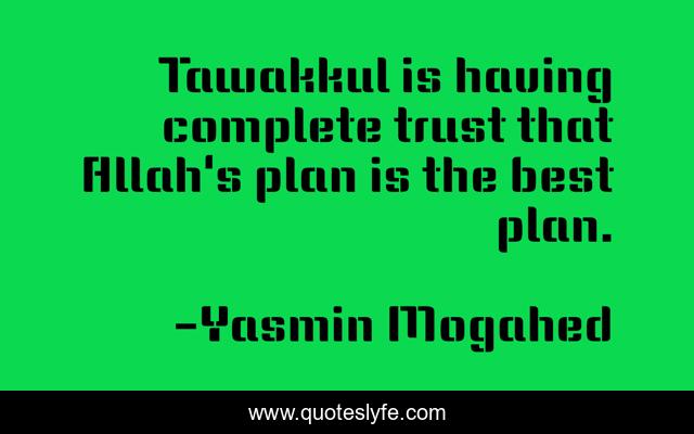 This page presents the quote "Tawakkul is having complete trust that Allah's plan is the best plan.". Author of this quote is Yasmin Mogahed. This quote is about tawakkul, faith, allah, islam,.
