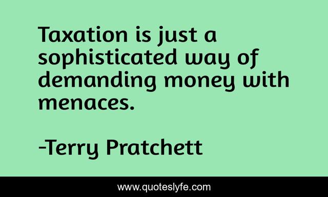 This page presents the quote "Taxation is just a sophisticated way of demanding money with menaces.". Author of this quote is Terry Pratchett. This quote is about taxation, way, just,.
