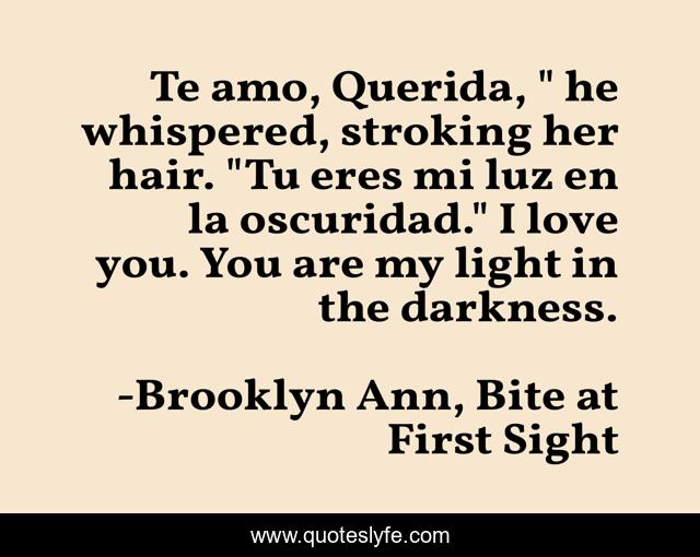 This page presents the quote "Te amo, Querida, " he whispered, stroking her hair. "Tu eres mi luz en la oscuridad." I love you. You are my light in the darkness.". Author of this quote is Brooklyn Ann, Bite at First Sight. This quote is about regency-romance, paranormal-romance, vampire-romance,.