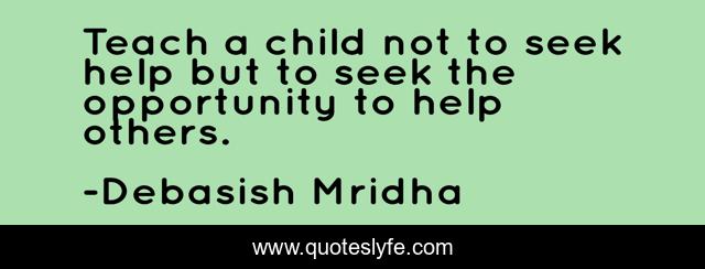 This page presents the quote "Teach a child not to seek help but to seek the opportunity to help others.". Author of this quote is Debasish Mridha. This quote is about how-to-raise-a-child, philosophy, debasish-mridha, teach-a-child, help-others, quotes, inspirational, enthusiasm, opportunity,.