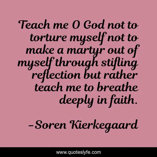 This page presents the quote "Teach me O God not to torture myself not to make a martyr out of myself through stifling reflection but rather teach me to breathe deeply in faith.". Author of this quote is Soren Kierkegaard. .