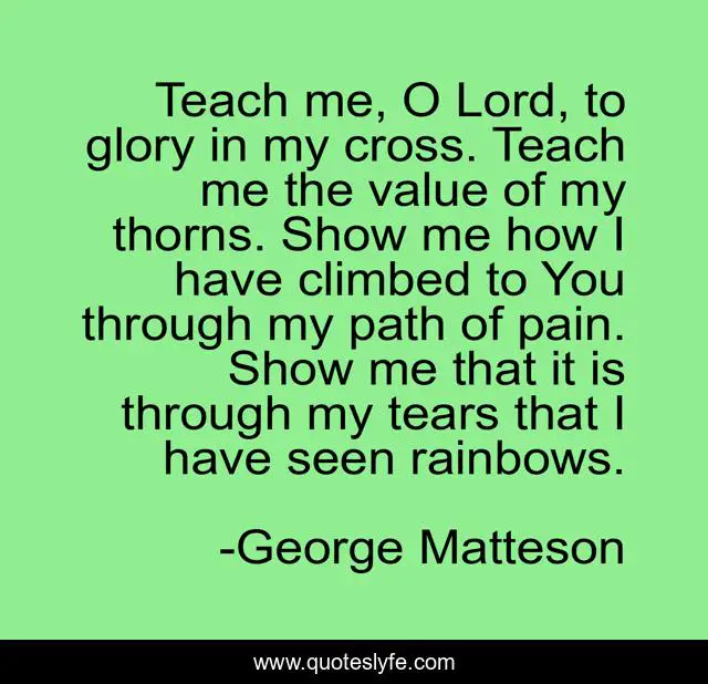 This page presents the quote "Teach me, O Lord, to glory in my cross. Teach me the value of my thorns. Show me how I have climbed to You through my path of pain. Show me that it is through my tears that I have seen rainbows.". Author of this quote is George Matteson. This quote is about rainbows, tears, pain, cross, teacher,.