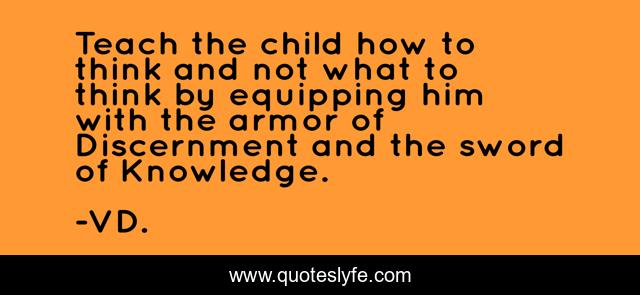 This page presents the quote "Teach the child how to think and not what to think by equipping him with the armor of Discernment and the sword of Knowledge.". Author of this quote is VD.. This quote is about education, children, critical-thinking,.