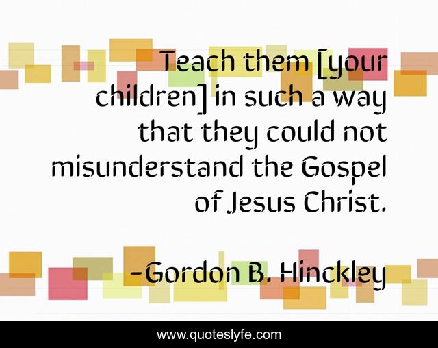 This page presents the quote "Teach them [your children] in such a way that they could not misunderstand the Gospel of Jesus Christ.". Author of this quote is Gordon B. Hinckley. This quote is about jesus-christ, gospel, teach, children,.