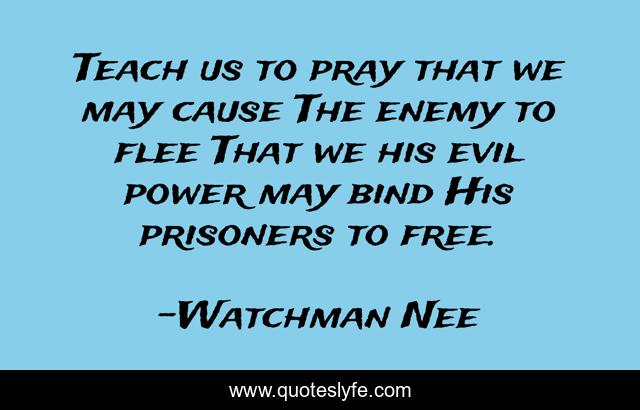 This page presents the quote "Teach us to pray that we may cause The enemy to flee That we his evil power may bind His prisoners to free.". Author of this quote is Watchman Nee. .
