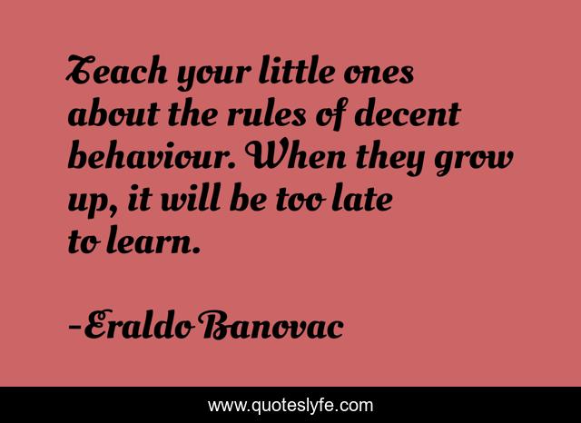 This page presents the quote "Teach your little ones about the rules of decent behaviour. When they grow up, it will be too late to learn.". Author of this quote is Eraldo Banovac. This quote is about sociology, behavior, rules, little-ones, decent-behavior, inspirational, enthusiasm, philosophy-of-life,.