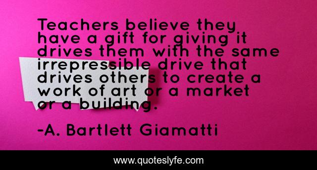 This page presents the quote "Teachers believe they have a gift for giving it drives them with the same irrepressible drive that drives others to create a work of art or a market or a building.". Author of this quote is A. Bartlett Giamatti. This quote is about work, believe, art,.
