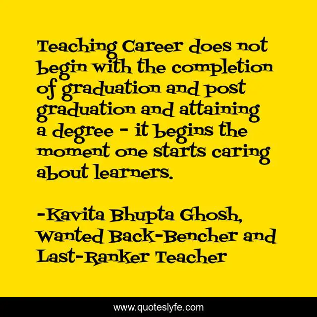 This page presents the quote "Teaching Career does not begin with the completion of graduation and post graduation and attaining a degree – it begins the moment one starts caring about learners.". Author of this quote is Kavita Bhupta Ghosh, Wanted Back-Bencher and Last-Ranker Teacher. .