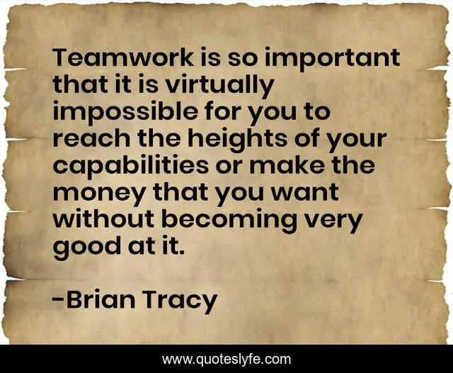 This page presents the quote "Teamwork is so important that it is virtually impossible for you to reach the heights of your capabilities or make the money that you want without becoming very good at it.". Author of this quote is Brian Tracy. This quote is about money, teamwork, impossible,.