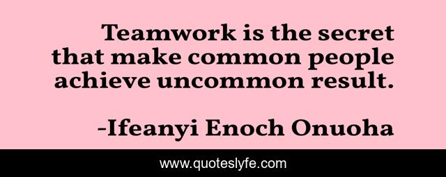 This page presents the quote "Teamwork is the secret that make common people achieve uncommon result.". Author of this quote is Ifeanyi Enoch Onuoha. This quote is about people, advice, torch, community, ifeanyi-enoch-onuoha, leadership, teamwork, uncommon, inspirational,.