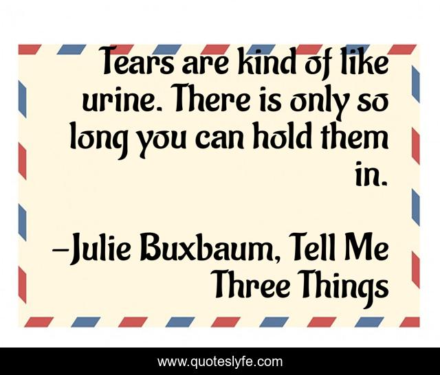 This page presents the quote "Tears are kind of like urine. There is only so long you can hold them in.". Author of this quote is Julie Buxbaum, Tell Me Three Things. This quote is about tears, crying,.