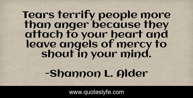 This page presents the quote "Tears terrify people more than anger because they attach to your heart and leave angels of mercy to shout in your mind.". Author of this quote is Shannon L. Alder. This quote is about conscience, lack-of-forgiveness, what-you-did, humbling, lack-of-compassion, responsible, mind, cruelty, giving-false-hope,.