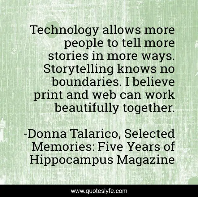 "Donna Talarico, Selected Memories: Five Years of Hippocampus Magazine Quotes." Quoteslyfe.com, 2025. Mon. 08 Dec. 2025. <https://www.quoteslyfe.com/quote/Technology-allows-more-people-to-tell-more-196550>.