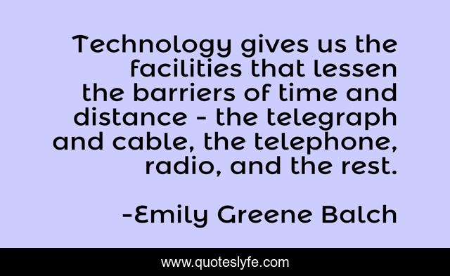This page presents the quote "Technology gives us the facilities that lessen the barriers of time and distance - the telegraph and cable, the telephone, radio, and the rest.". Author of this quote is Emily Greene Balch. This quote is about distance, technology, rest,.