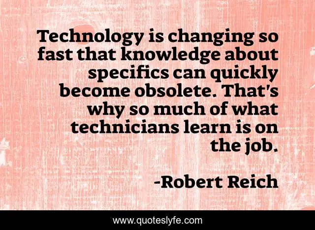 This page presents the quote "Technology is changing so fast that knowledge about specifics can quickly become obsolete. That's why so much of what technicians learn is on the job.". Author of this quote is Robert Reich. This quote is about job, technology, why,.