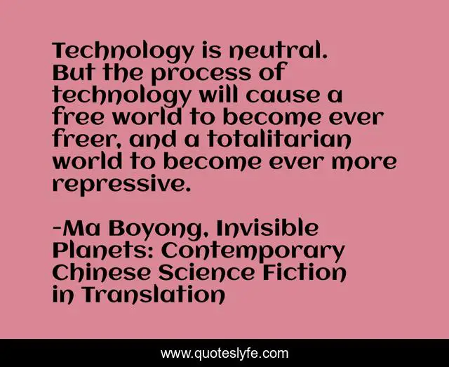 This page presents the quote "Technology is neutral. But the process of technology will cause a free world to become ever freer, and a totalitarian world to become ever more repressive.". Author of this quote is Ma Boyong, Invisible Planets: Contemporary Chinese Science Fiction in Translation. This quote is about repression, freedom, totalitarianism, technology,.