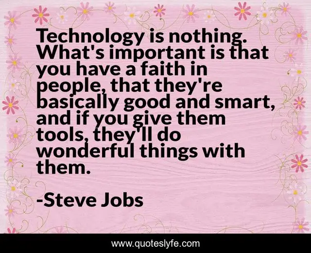 This page presents the quote "Technology is nothing. What's important is that you have a faith in people, that they're basically good and smart, and if you give them tools, they'll do wonderful things with them.". Author of this quote is Steve Jobs. This quote is about faith, technology, smart,.