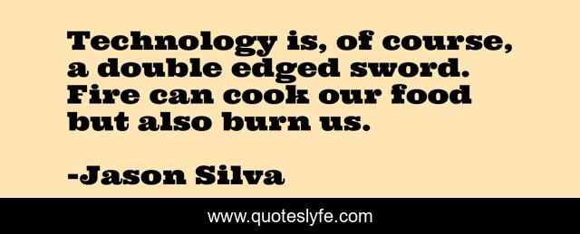 This page presents the quote "Technology is, of course, a double edged sword. Fire can cook our food but also burn us.". Author of this quote is Jason Silva. This quote is about fire, technology, sword,.