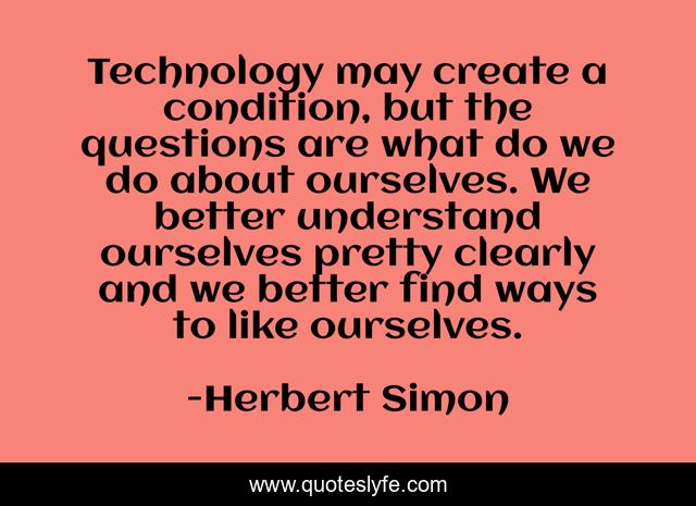 This page presents the quote "Technology may create a condition, but the questions are what do we do about ourselves. We better understand ourselves pretty clearly and we better find ways to like ourselves.". Author of this quote is Herbert Simon. This quote is about better, find, questions,.