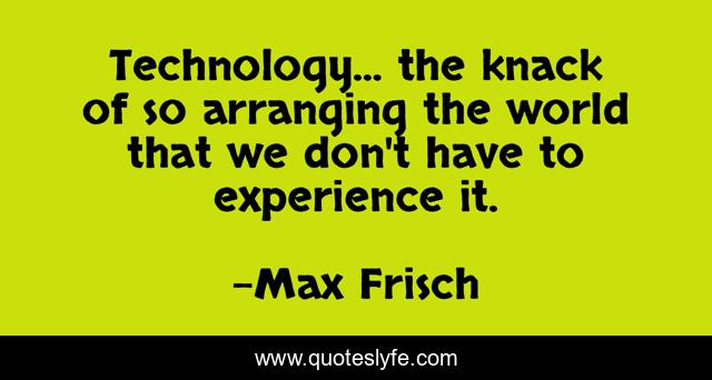 This page presents the quote "Technology... the knack of so arranging the world that we don't have to experience it.". Author of this quote is Max Frisch. This quote is about world, knack, technology,.