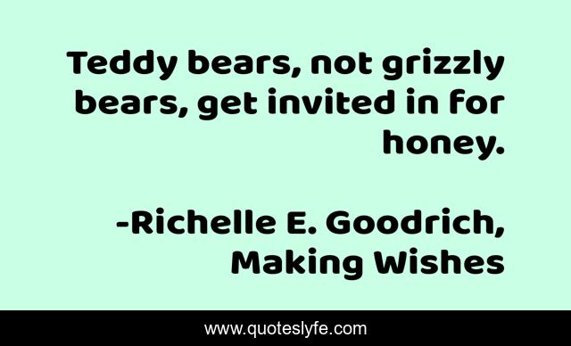 This page presents the quote "Teddy bears, not grizzly bears, get invited in for honey.". Author of this quote is Richelle E. Goodrich, Making Wishes. This quote is about grouchiness, kind, grouchy, richelle-e-goodrich, be-kind, teddy-bears, grizzly-bears, richelle, richelle-goodrich,.