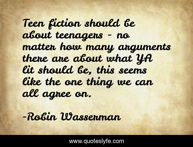 This page presents the quote "Teen fiction should be about teenagers - no matter how many arguments there are about what YA lit should be, this seems like the one thing we can all agree on.". Author of this quote is Robin Wasserman. This quote is about lit, matter, teenagers,.