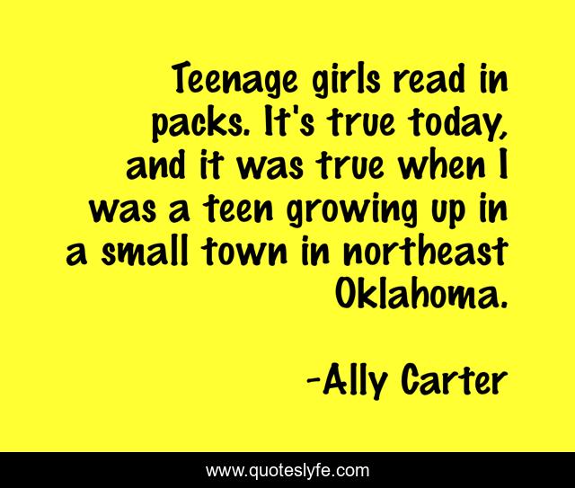 This page presents the quote "Teenage girls read in packs. It's true today, and it was true when I was a teen growing up in a small town in northeast Oklahoma.". Author of this quote is Ally Carter. This quote is about small, growing up, today,.