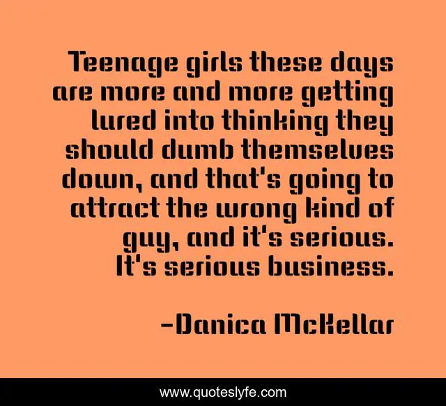 This page presents the quote "Teenage girls these days are more and more getting lured into thinking they should dumb themselves down, and that's going to attract the wrong kind of guy, and it's serious. It's serious business.". Author of this quote is Danica McKellar. This quote is about thinking, down, dumb,.
