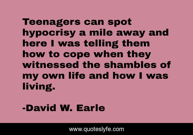 This page presents the quote "Teenagers can spot hypocrisy a mile away and here I was telling them how to cope when they witnessed the shambles of my own life and how I was living.". Author of this quote is David W. Earle. This quote is about love, recovery, family, hypocrisy, chaos, dysfunctional-families, teenagers, change, affection,.