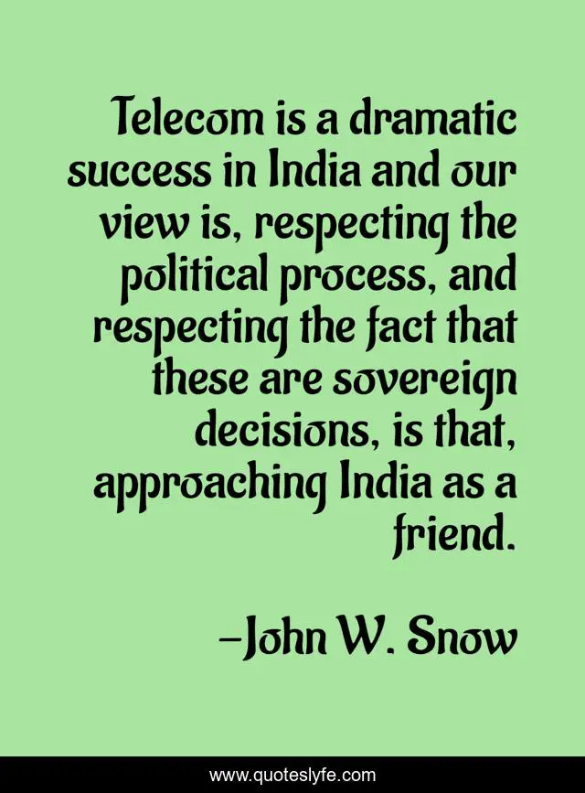 This page presents the quote "Telecom is a dramatic success in India and our view is, respecting the political process, and respecting the fact that these are sovereign decisions, is that, approaching India as a friend.". Author of this quote is John W. Snow. This quote is about decisions, political, friend,.
