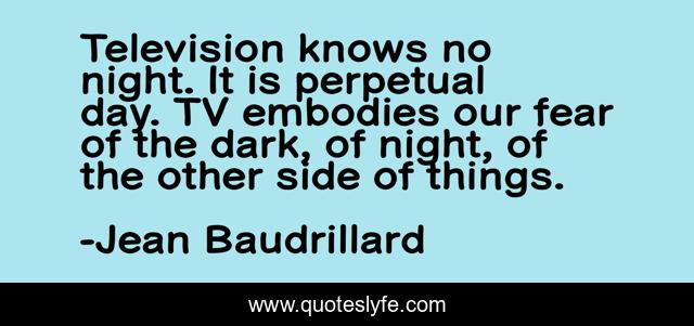 This page presents the quote "Television knows no night. It is perpetual day. TV embodies our fear of the dark, of night, of the other side of things.". Author of this quote is Jean Baudrillard. This quote is about television, tv, dark, night, fear, day,.