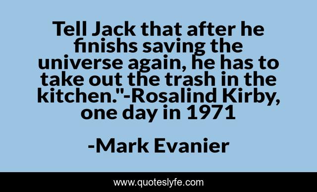 This page presents the quote "Tell Jack that after he finishs saving the universe again, he has to take out the trash in the kitchen."-Rosalind Kirby, one day in 1971". Author of this quote is Mark Evanier. This quote is about humorous, kirby, marriage,.