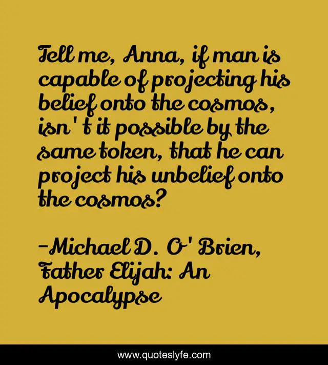 This page presents the quote "Tell me, Anna, if man is capable of projecting his belief onto the cosmos, isn't it possible by the same token, that he can project his unbelief onto the cosmos?". Author of this quote is Michael D. O'Brien, Father Elijah: An Apocalypse. This quote is about unbelief, belief,.