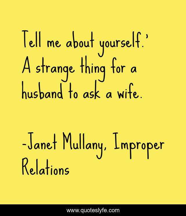 This page presents the quote "Tell me about yourself.' A strange thing for a husband to ask a wife.". Author of this quote is Janet Mullany, Improper Relations. .