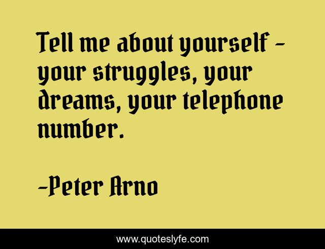 This page presents the quote "Tell me about yourself - your struggles, your dreams, your telephone number.". Author of this quote is Peter Arno. This quote is about your dreams, me, yourself,.