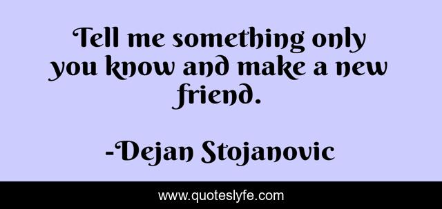 This page presents the quote "Tell me something only you know and make a new friend.". Author of this quote is Dejan Stojanovic. This quote is about friendship, poets, literature, dejan-stojanovic, philosophy, poetry, wisdom, quotes, books,.