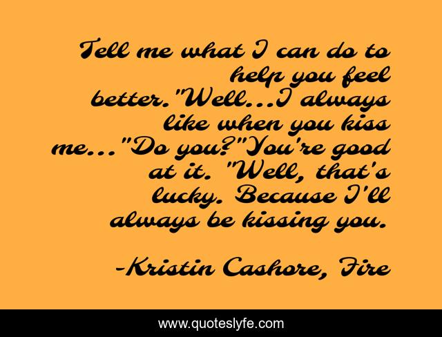 This page presents the quote "Tell me what I can do to help you feel better."Well...I always like when you kiss me..."Do you?"You're good at it. "Well, that's lucky. Because I'll always be kissing you.". Author of this quote is Kristin Cashore, Fire. This quote is about cute, love, flirtation, affection, kissing,.